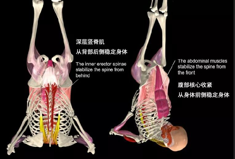 所以,在肩倒立的体式中,一定要激活核心,不仅身体前侧的腹部,还有背部以及盆底肌等都要很好的激活,才能更好的保持身体的稳定。