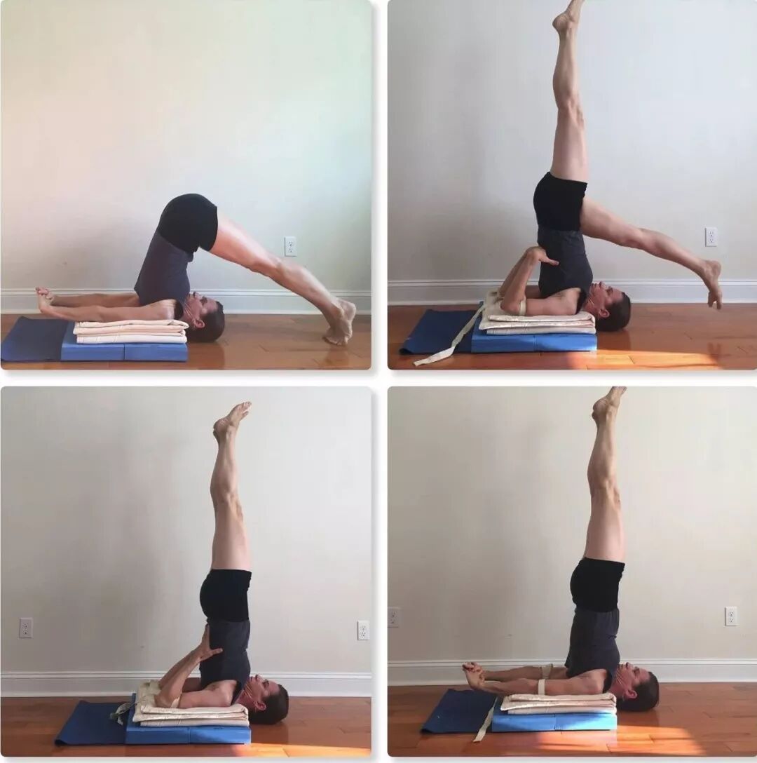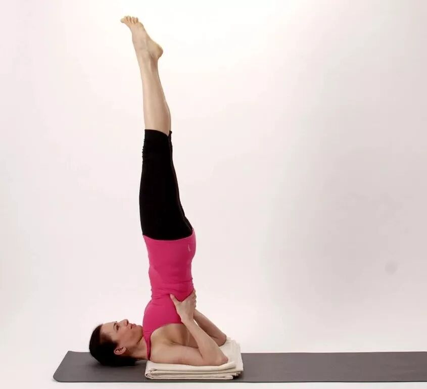 在肩倒立体式中,除了保持根基的稳定,为了减少根基的压力,避免受伤,一定要保持身体一条直线。如果初学者前期无法做到身体一条直线,可以先借助辅具进行练习。