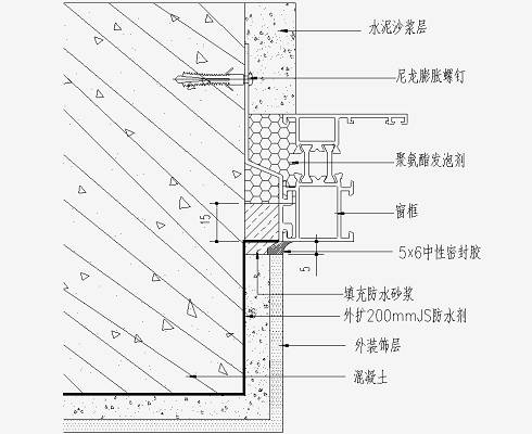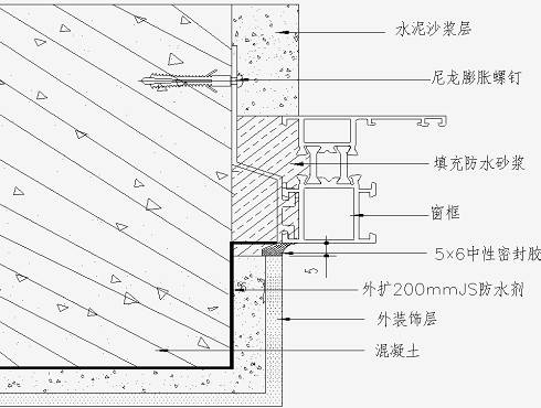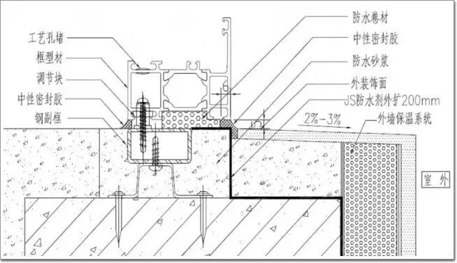窗框安装前洞口需粉刷一道水泥砂浆,使洞口表面光洁、尺寸规整。外窗窗台板基体表面上应浇成3-5%的向外泛水,其伸入墙体内的部分应略高于外露板面。