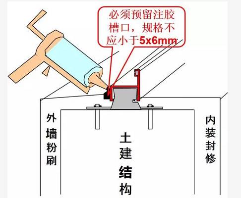 外门窗框外侧必须留5mm宽、6mm深的注胶槽口;
