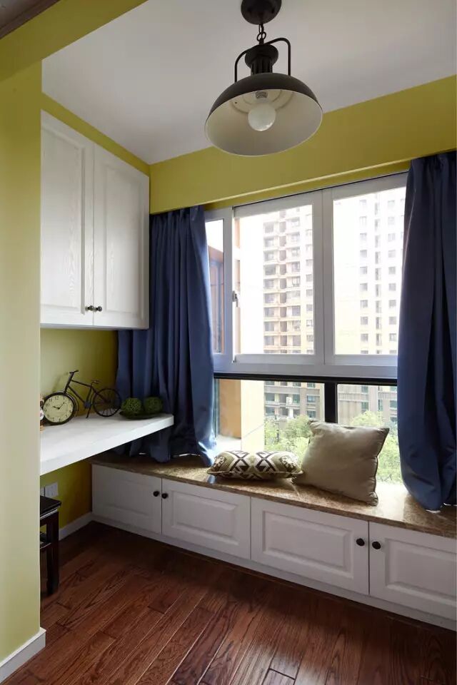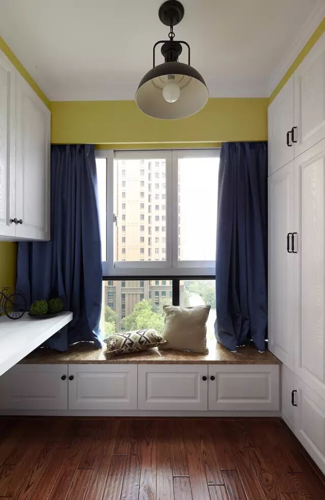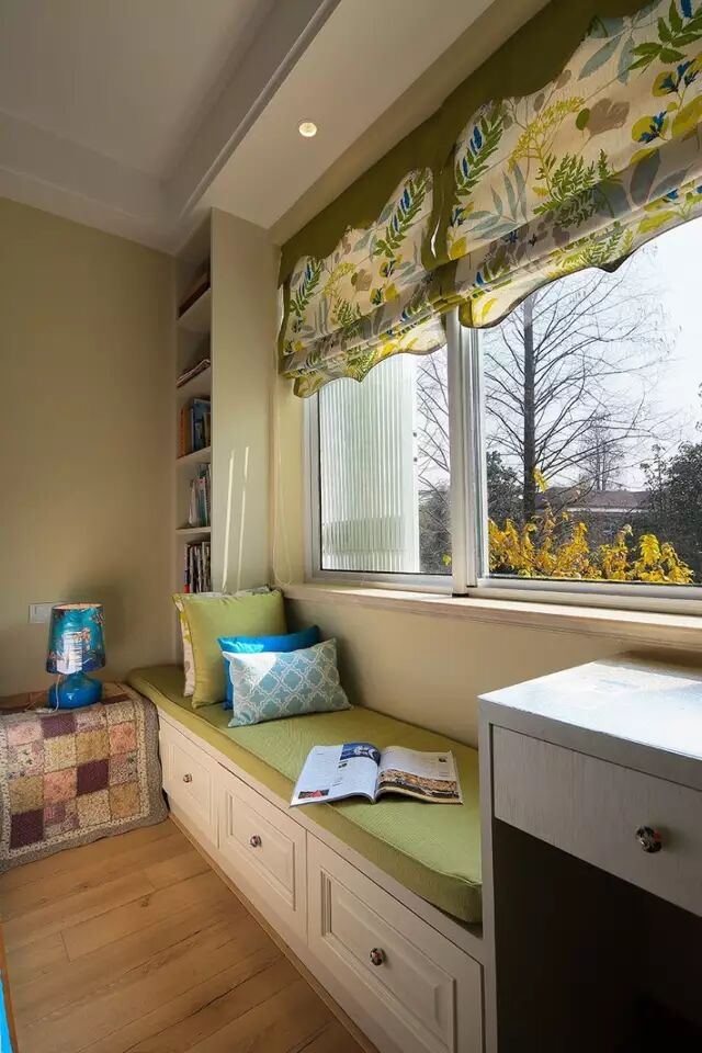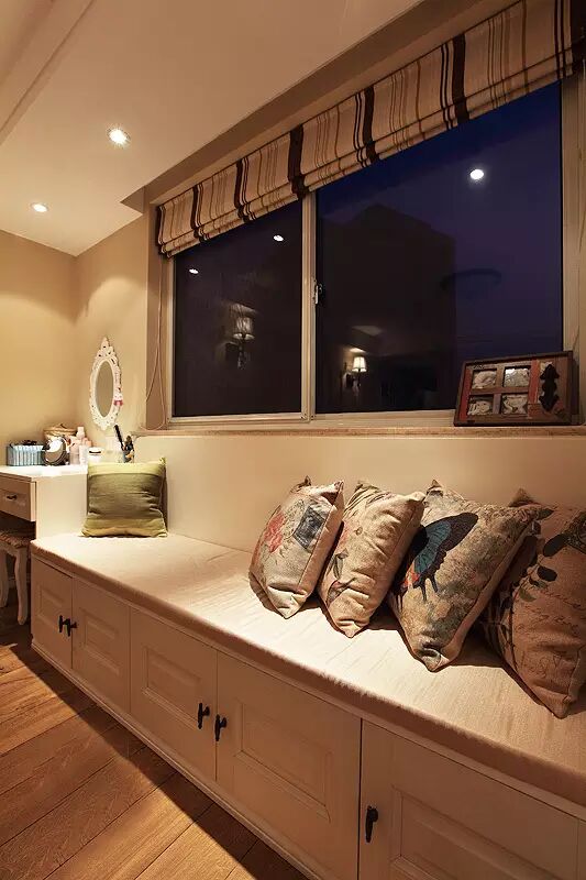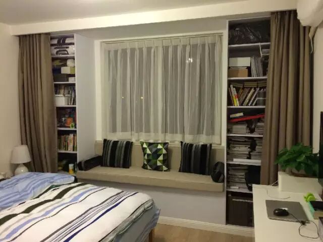 小飘窗加上坐垫、窗帘就可以用来收纳,