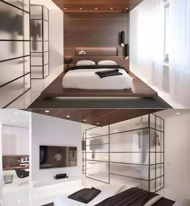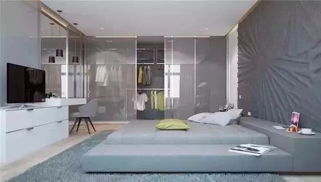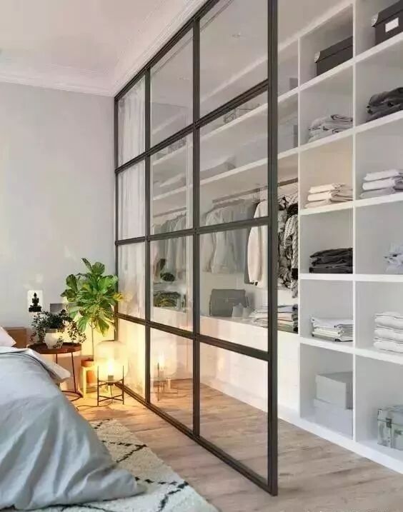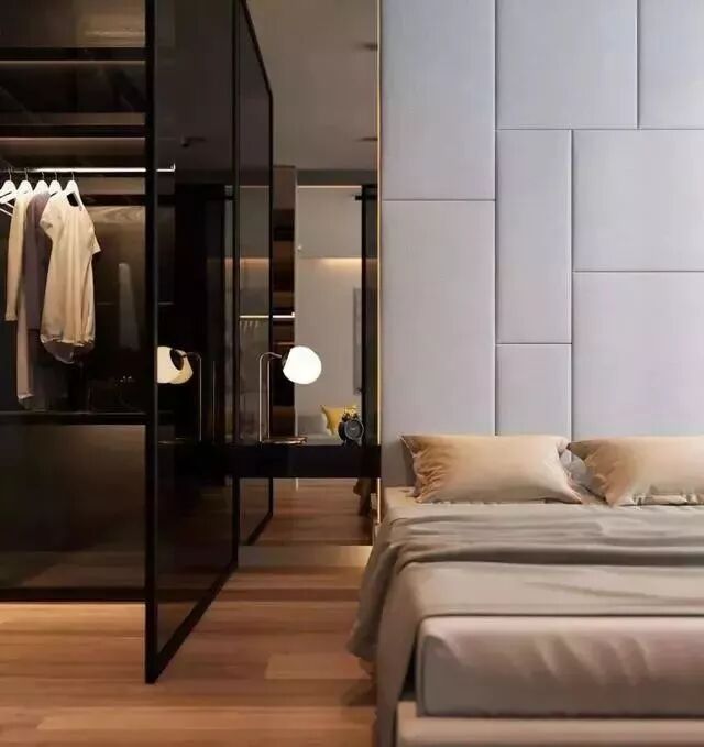 觉得透明的玻璃不具备隐私的话,可以试试磨砂玻璃衣橱,创造朦胧美的同时,让柜内空间不完全裸露。