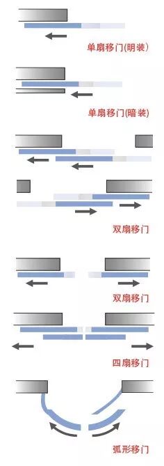 移门也就是我们常说的推拉门,移门设计最大的优点就是节省空间,增加采光,当对于平开门密封性较差,随着科技材料的发展,移门的使用范围也越来越广,种类也多种多样,通常分为平贴式、嵌入式和折叠式,移门的开启路径及常规配置有如下形式: