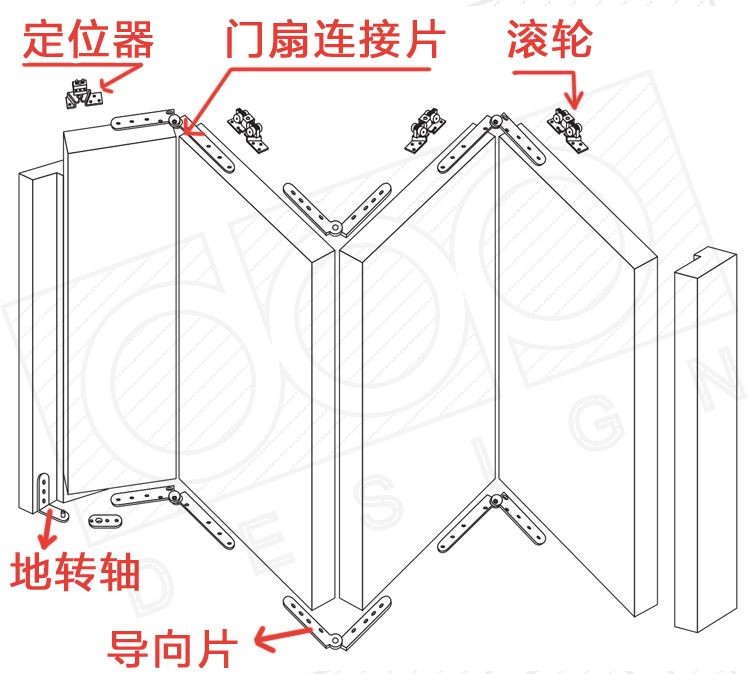 移门通过导轨里面的滚轮滑动,如果在门扇与门扇之间加上合页构件,就变成了折叠门,如下图所示: