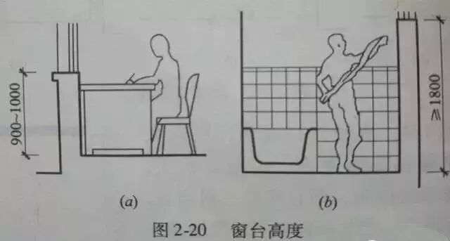 对于特殊位置的窗台,如卫生间、浴室以及房屋后窗,为了保证隐私,高度可以设置为1800mm。设火炕的农村住宅,窗台一般高于火炕200~300mm。