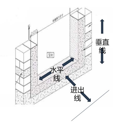 洞口放线:根据墙面的水平标高线,测出洞口水平基准线、洞口水平中间线、洞口垂直中心线,以此确定门窗安装位置。