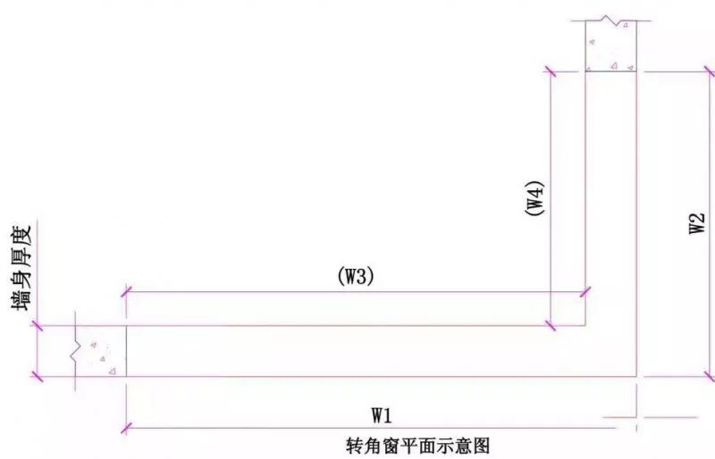 转角窗洞口的测量,其高度测量跟常规洞口基本一致,但在测量外沿宽度(W1\W2)与内沿宽度(W3\W4)时,则有明显的区别。一般来说,测量宽度都以外沿尺寸为准:正面测量时,量出阳台顶面外侧转角至外侧墙体的距离,为W1;侧面测量时,同样量出阳台顶面外侧转角至外侧墙体的距离,为W2;量出W1、W2宽度后,还必须测量窗台或者墙身的厚度,因为墙身的厚度与产品系列的选用以及产品的安装位置都会影响成品的宽度尺寸。
