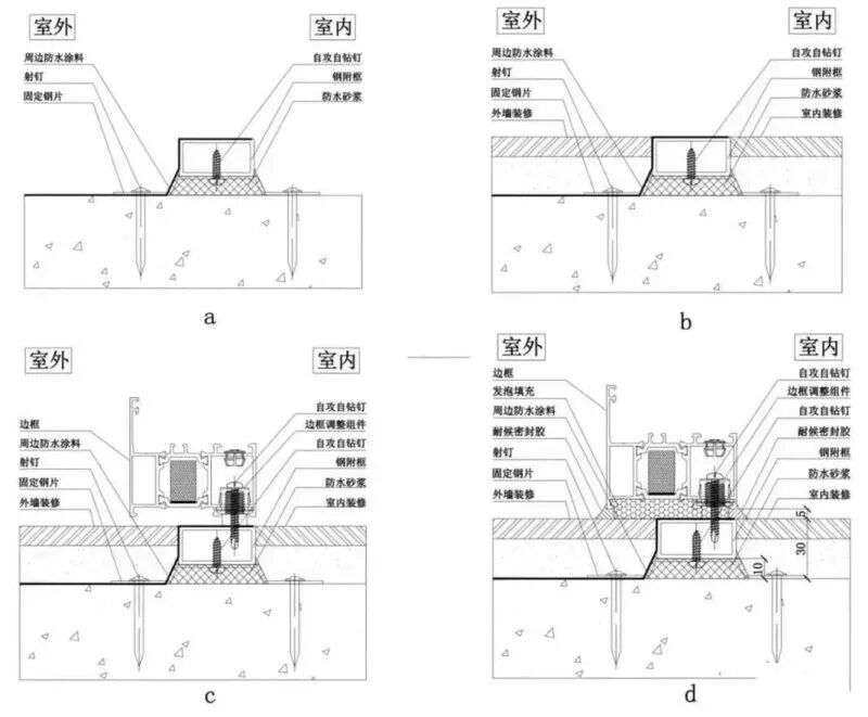 a、在毛坯洞口预埋钢副框,钢副框上墙调好水平后,附框与洞口间的缝隙填充防水砂浆,副框与洞口间的缝隙要预留10mm以上,固定好副框后,在室外侧副框与洞口间涂刷防水涂料;