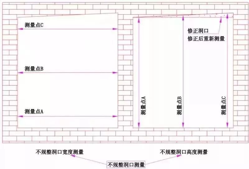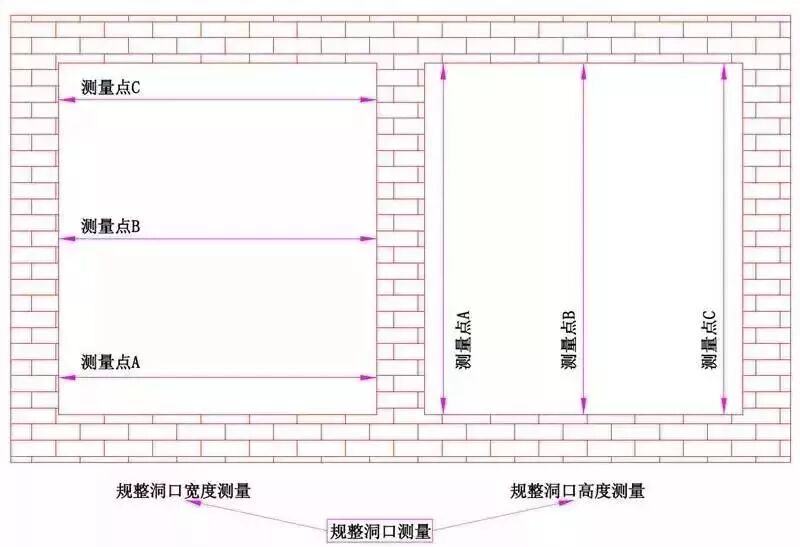 以门窗在洞口内安装横平竖直为基准,至少记录3个测量点,并取最小值为准,对于不规则或者偏差严重的洞口则需要对洞口进行修整,完毕后再重新测量,洞口测量点要尽量选取较为平整的面,杜绝明显凸点或者凹点的面。
