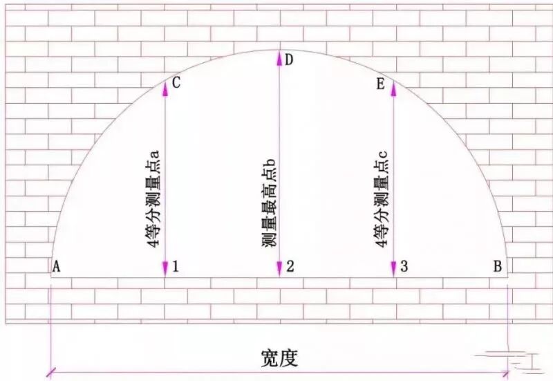 先测出弦长和弧高,然后把弦长分成若干份,在AB 上标出对应点1、2、3, 先测出A1、A2、A3 的尺寸,再测出C1、D2、E3的尺寸(测量过程中一定要保证C1、D2、E3 与AB 垂直),记录好几组测量数据后,根据测量的C、D、E点,用圆滑的曲线描绘出弧形的洞口尺寸,弦长分成的等分越多,描绘出来的洞口尺寸越准确。