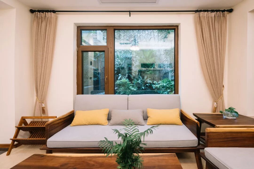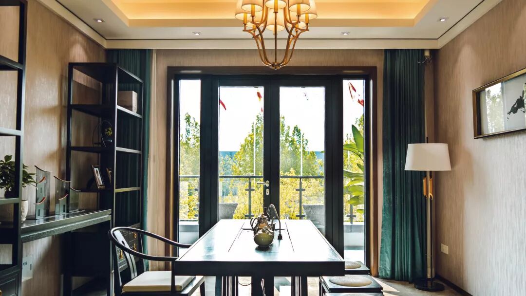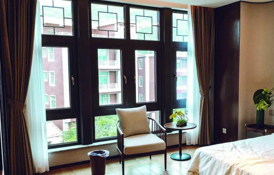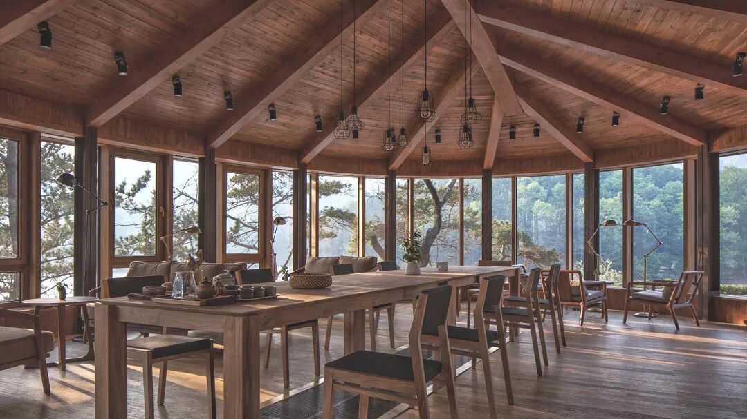 望着窗外清朗葱郁的闲情逸景,木作屋檐内饰与木质门窗,营造出质朴清雅的意趣。