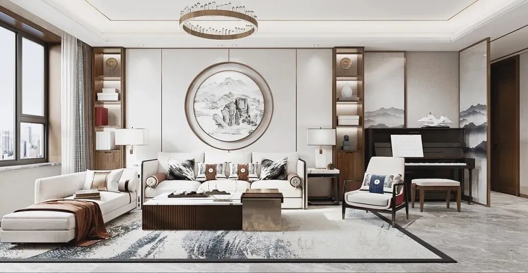 新中式风格中常把山水、花鸟等元素画运用在家居宅第的布局和陈设中,不仅能提升空间格调,还能体现居者的生活与文化品位。