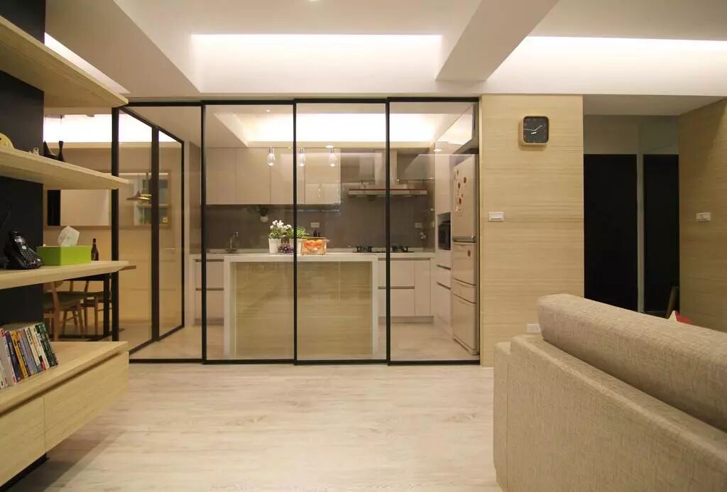 门的形式:因为厨房位置有限,很多情况下不能做开门,而且因为厨房不需要私密性,但需要不占空间,炒菜的时候可能会进进出出,所以能做的有滑门和折叠门,其中滑门最常见;