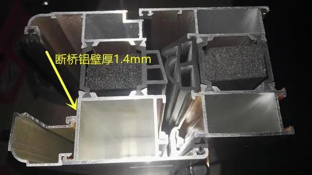 我们都知道市面上对于断桥铝的壁厚有严格要求,需要在1.4mm以上,而普通的彩铝门窗壁厚多在1mm左右,更有甚者会偷工减料,壁厚更薄。