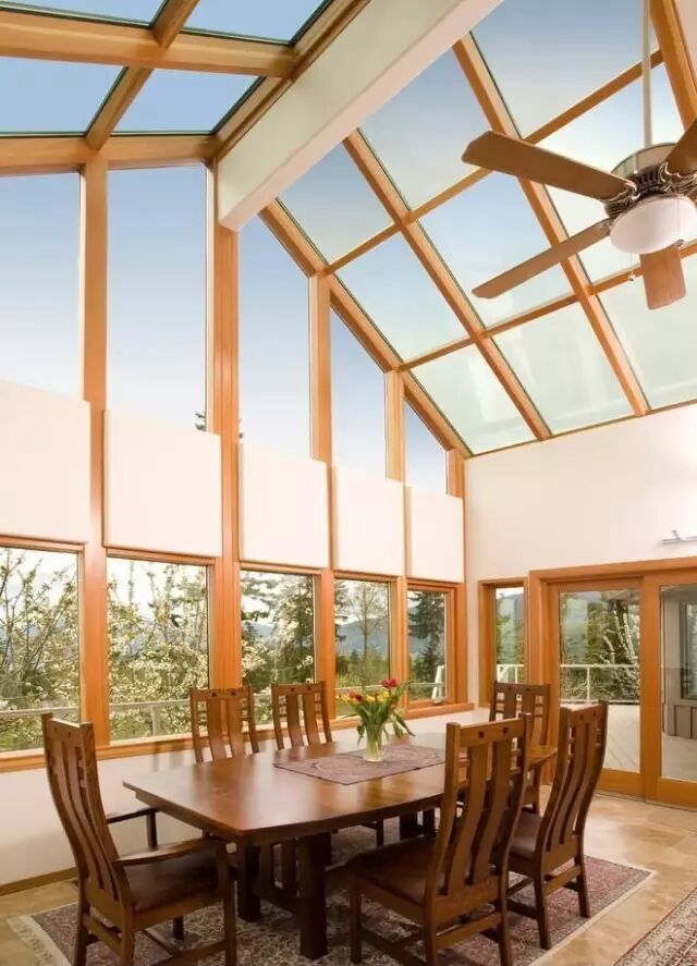 为什么高档阳光房夏天不热?其实是因为在顶部开了天窗,有些大型阳光房会开四到六个天窗,另外还加装了可以覆盖整个阳光房顶部的电动遮阳帘,轻轻一按,空调开启,正午时分,遮阳开启,加上有中空玻璃和断桥铝把热度从根源上隔绝,智能控制系统加上顶极型材,想要夏天的阳光房变热都难!