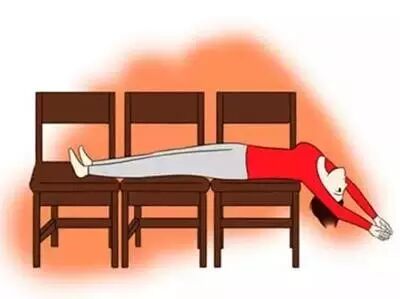 3.躺下仰卧,右脚伸直倚在墙柱或门框上,左脚屈膝落地,尽量触及地面,双手举起平放在椅上(见图),做十分钟。期间左脚亦可作踏单车姿势摆动,有利放松髋部的关节。