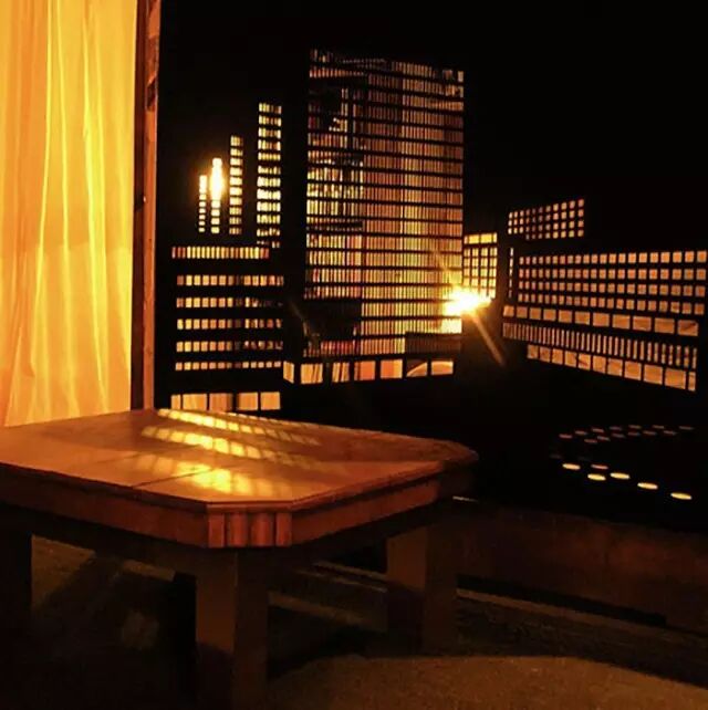艺术家把城市的剪影刻成的落地窗帘,