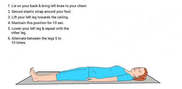 仰卧,弯曲左膝盖,瑜伽带套在左脚掌