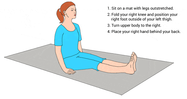扭转向右,左手肘抵住右膝盖外侧,右手往后撑地