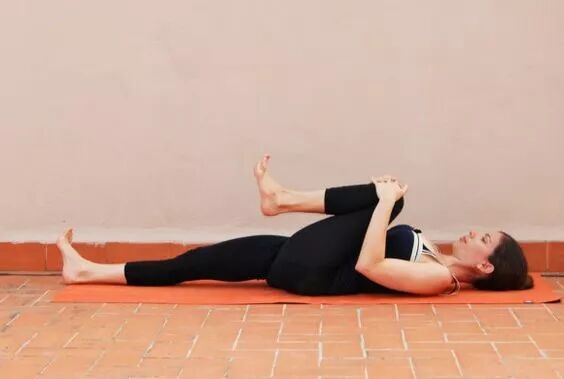 仰卧在垫子上,屈左膝靠近胸腔