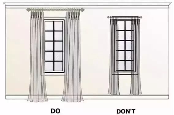 窗帘的悬挂高度:不要瞎节约那几寸布,窗帘挂高几厘米就能让层高显高几厘米,就像穿大长裙能显高是一个道理,从高于窗框上沿的13~18cm处开始悬挂效果较佳。