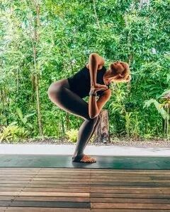 呼气屈髋屈膝到幻椅,双手胸前合十