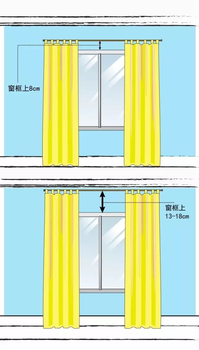 悬挂时,最好高于窗框15cm处或者更高,看起来就修长,也可以在视觉上拉高房屋。