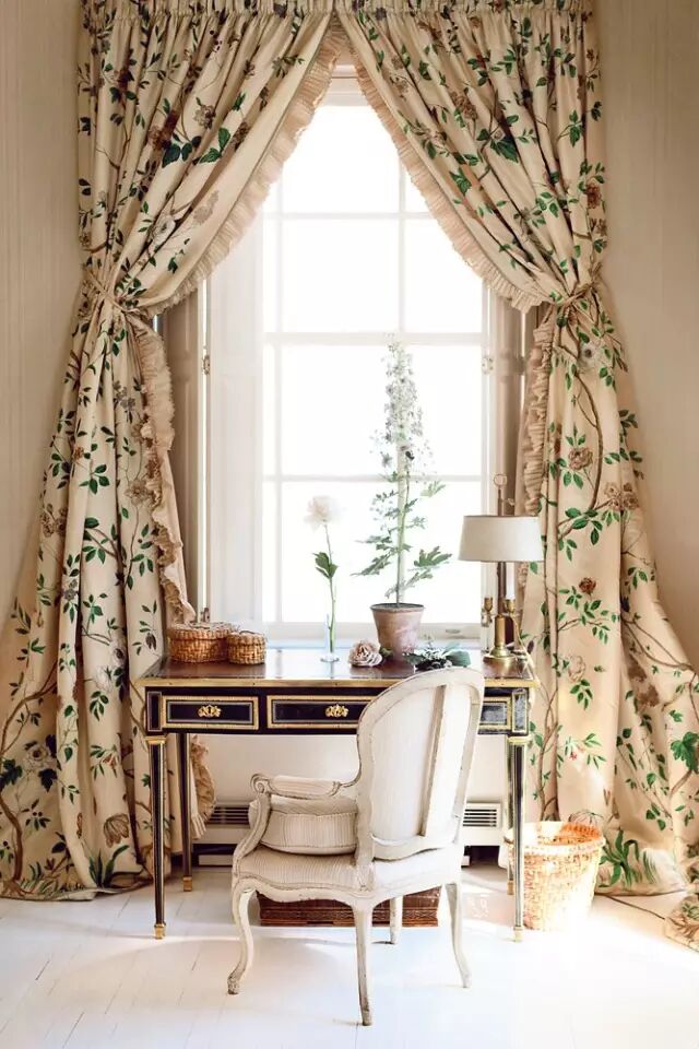如果窗户外面有绿植,挂上树叶形状的窗帘很有意思,拉上窗帘也觉得绿意盎然。花样繁复的窗帘,对整体配色要求很高。如果对配色不太在行,就不要轻易尝试了。