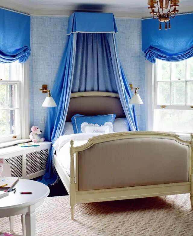 突出色系就是床上抱枕的蓝色,以及桌上花束的蓝色,这时选择蓝色的窗帘就会显得很协调。