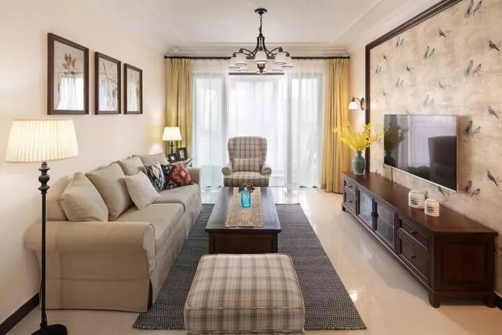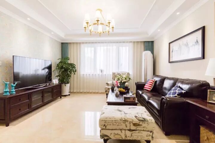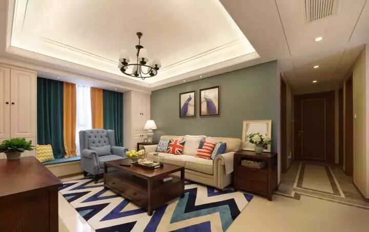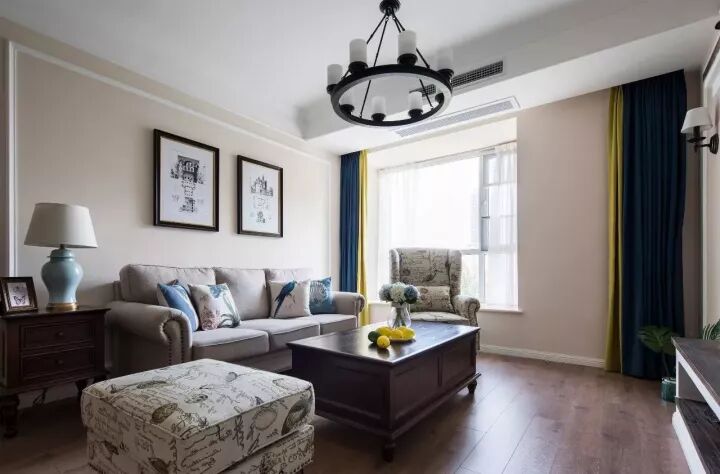 ▼美式客厅,选得家具及沙发都是如此的“正规”,而且也都是深色调,因此搭配了撞色窗帘,白色、黄色、蓝色组合,形成一个视角亮点,从而让这个客厅看起来没那么“正规”;