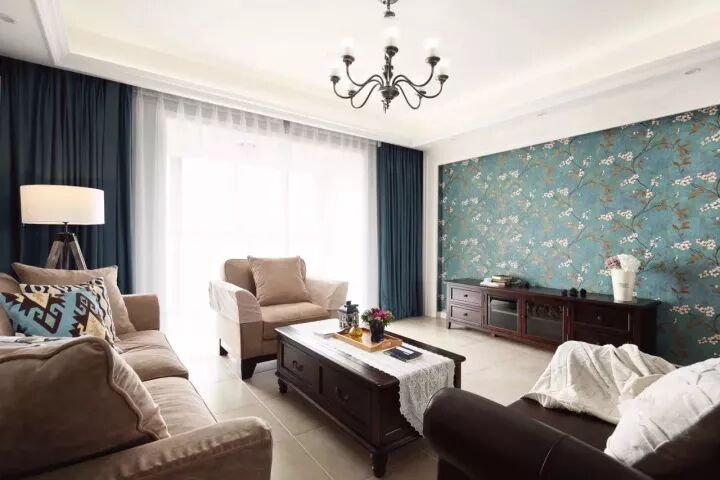 ▼沙发背景墙书绿色,所以选购了比墙面色更深的窗帘,再搭配了蓝色,让整体更有层次;