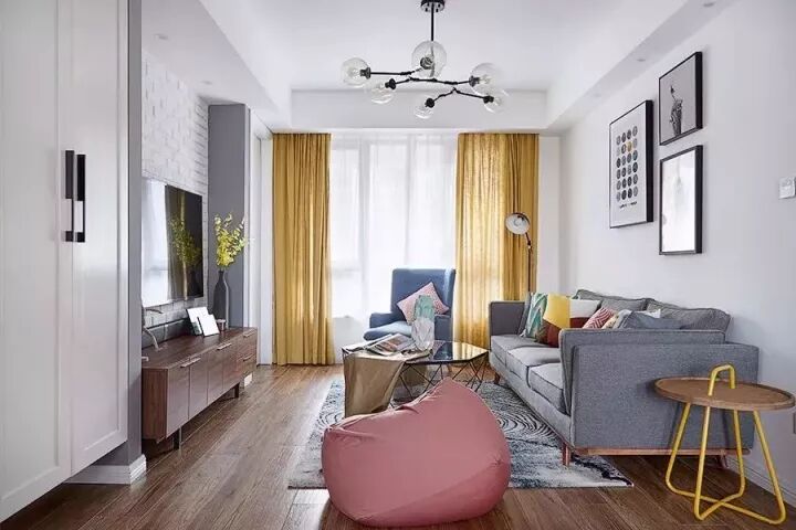▼在这个北欧客厅,墙面刷白,搭配木色茶几、灰色沙发、还有比较鲜艳的红色懒人沙发,为了让整个空间看起来更加平衡,所以搭配了暖色调黄色窗帘,与懒人沙发一起点亮空间;
