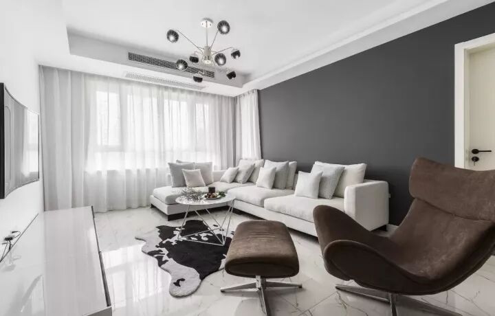 ▼整体色调为白色、深灰色,然后咖色点缀,搭配白色的窗帘,让整体空间看起来更大大气;