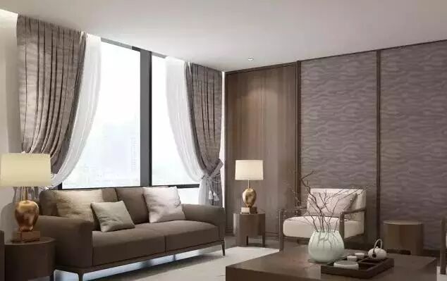 如水波荡漾,又似古木竖纹,古典的端庄与现代的时尚完美融合,整个空间在简洁素雅间,透出一份端庄优雅,配以带有新中式特色的褐色家具,只需一副茶具,瞬间禅意浓浓。