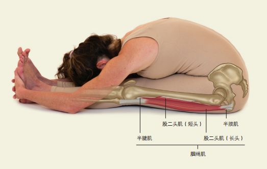 如果腘绳肌较紧,可以弯曲膝盖或在 下方垫一张毯子。你也可以坐在瑜伽砖或毯子上。脊柱伸展到最大限度后,就可以向前折弯,就像图中所画的那样。