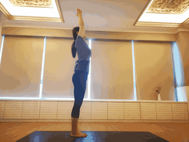 站直且双脚平行,分开与髋同宽。吸气,然后呼气,并举起手臂高于上背部。