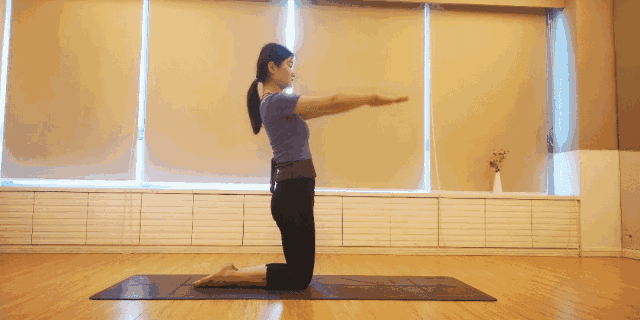 开始上下抬起手臂,吸气数5下,呼气数5下。可以适当调整,屈膝90度。数到100。