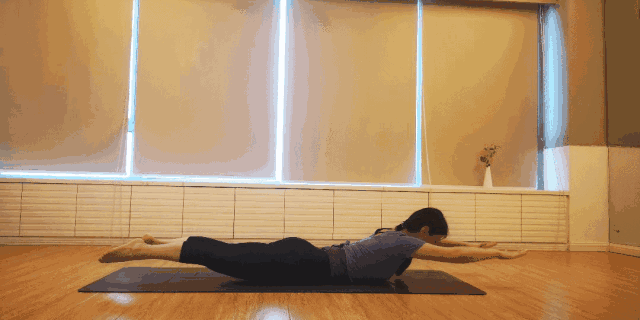 俯卧,手臂放在肩膀下方。启用肌肉,头微微离开地面,抬起胸腔,手臂往前伸直离地3厘米。