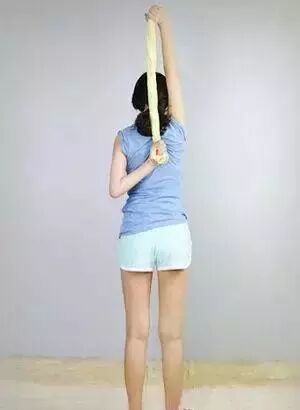 双手背后抓毛巾,右手在上、左手在下,然后右手慢慢向上拉毛巾,如下图: