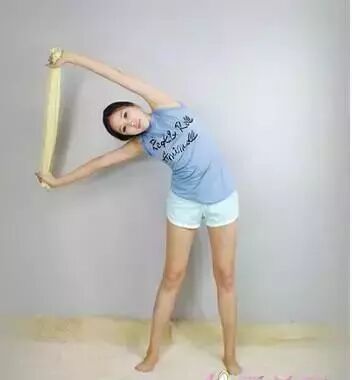 双手依次将身体拉向两侧,抓毛巾的位置不变,下方的手尽可能向下拉毛巾。