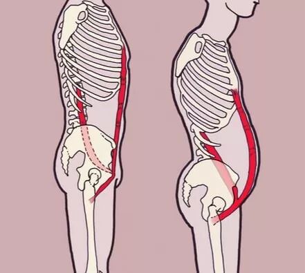 其次,它还会进一步加剧骨盆前倾,导致腹部无力,以及腰背部的疼痛问题。
