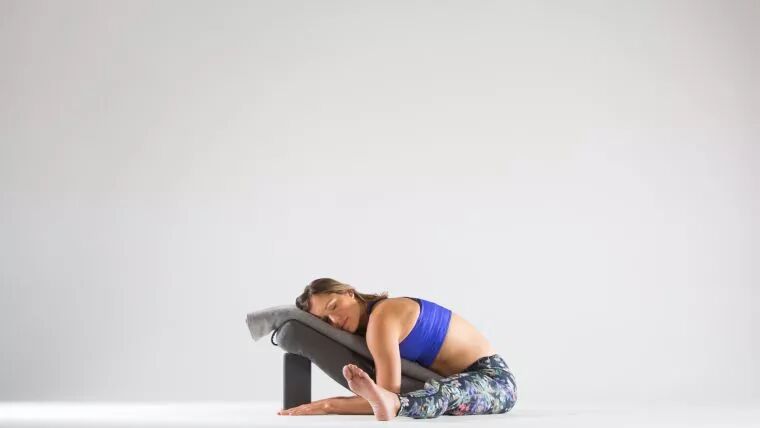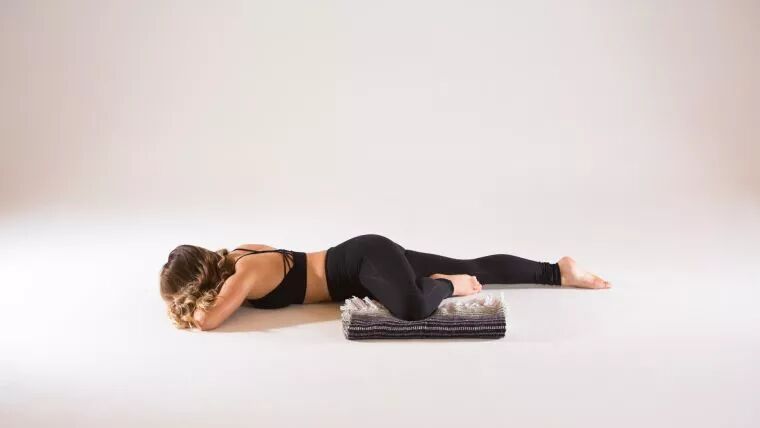 身体前侧放瑜伽抱枕瑜伽毯垫高