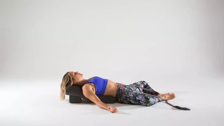 仰卧在抱枕上,也可以借助伸展带