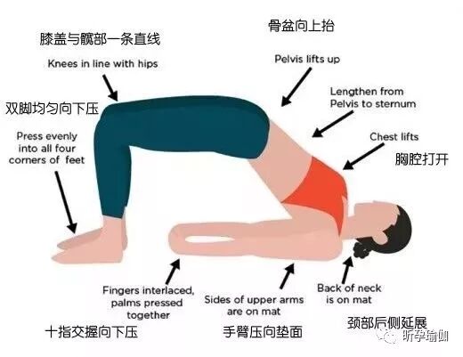 进入:仰卧,双手放在身体的两侧,双脚打开与髋部同宽,双脚脚尖指向正前方,屈双膝靠近臀部,小腿与地面垂直,呼气,抬起髋部向上,双肩双手臂向下压向地面,胸腔向上抬起,