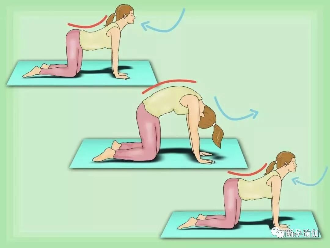 保持:吸气,坐骨向后推开,臀部向上,腹部收紧下沉,挺胸,抬头;呼气,尾骨内收拱背含胸,下巴寻找锁骨,眼睛看向肚脐,背部尽量向上,呈弧形;动态练习8-10次。