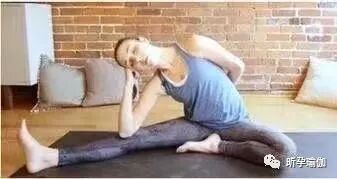 保持:将右手肘放在右大腿上方,左手随吸气由体侧向上,呼气向后,放右侧腰部,或左手向上往头顶方向延展;保持10次呼吸。