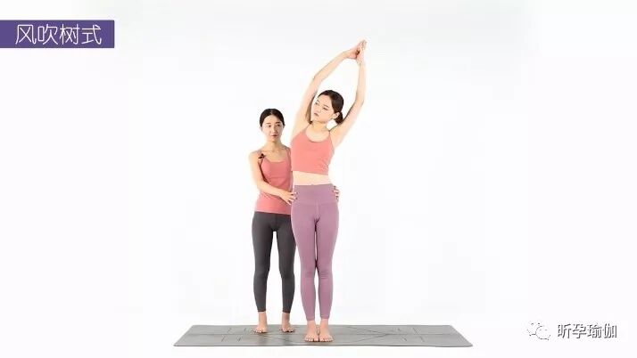 进入:山式站立,双脚并拢或双脚分开与肩同宽。吸气双臂体侧高举过头,掌心朝内。呼气时,身体由腰部向左弯,手臂和手指向远延伸。