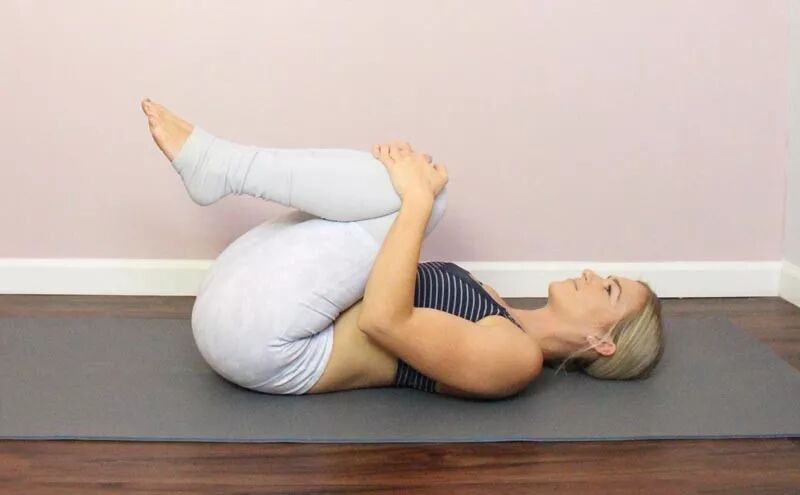 双手抱住双膝前侧,将膝盖拉向胸腔