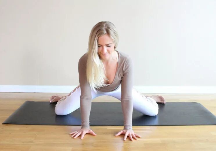 益处:有效拉伸双腿内侧,帮助打开髋部,滋养骨盆,放松腰背部