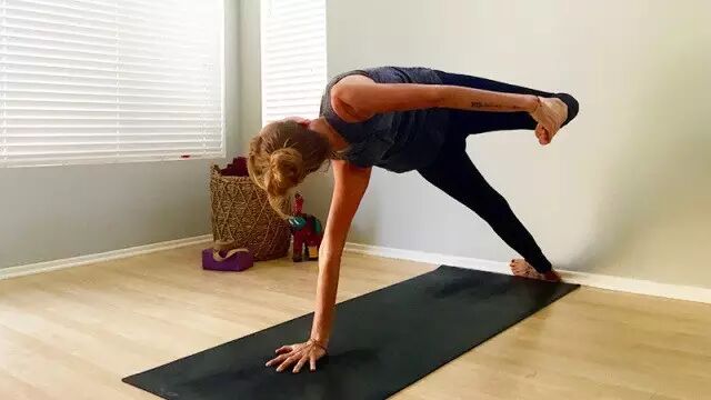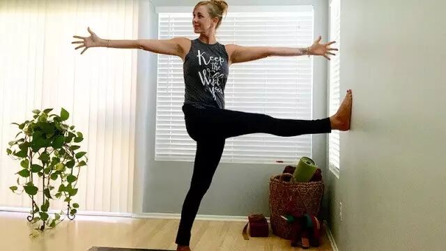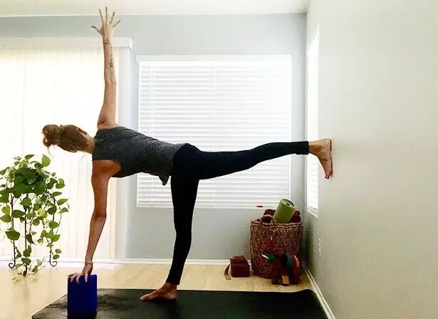 单侧支撑的体式山鹑式Kapinjalasana或者侧板式Vasisthasana,都可以后面的脚放在墙上做个支撑,这样可以让体式的其他部分充分展开。